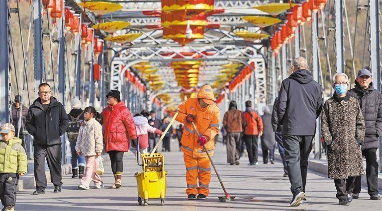 2月18日,环卫工人在甘肃省兰州市中山桥清理路面卫生。侯崇慧摄(中经视觉)