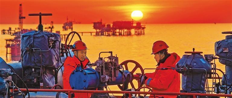 2月17日,中国石化胜利油田埕岛中心三号平台,员工迎着新年第一缕阳光巡检设备。春节期间,各行各业劳动者扎根一线,坚守岗位,传递别样年味和温暖。张 灿摄(中经视觉)