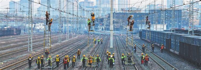 2月18日,国铁集团郑州局新乡供电段接触网工在检修供电设施。王 玮摄(中经视觉)