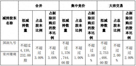 据公告,合计持有公司5%以上股份的股东常州国润九号企业管理咨询合伙企业(有限合伙)(持有6,624,800股,占公司总股本4.80%,以下简称“国润九号”)、常州珊瑚私募基金管理合伙企业(有限合伙)-常州国润九号企业管理咨询合伙企业(有限合伙)(持有6,584,800股,占公司总股本4.77%,以下简称“常州珊瑚”)计划自本公告披露之日起15个交易日后的连续90个自然日内通过集中竞价交易和/或大宗交易方式减持其持有的公司股份不超过4,130,232.00股,占目前剔除公司回购专用账户中的股份数量后总股本的3.00%。