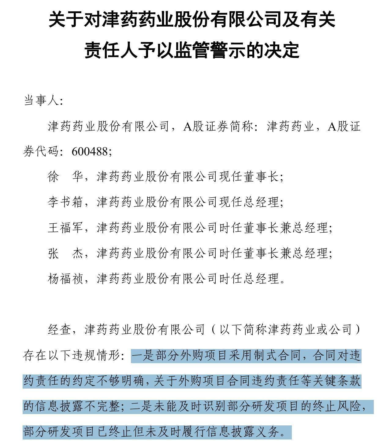 同日,津药药业也公告收到了上交所《关于对津药药业股份有限公司及有关责任人予以监管警示的决定》。