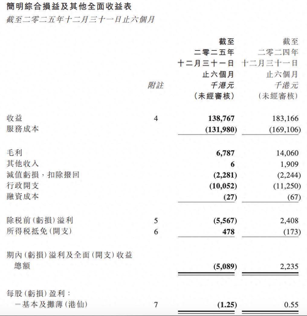 财报显示,集团于截至2025年12月31日止6个月的收益约为1.39亿港元,上年同期约1.83亿港元,跌幅约为24.2%;除税前亏损约为560万港元,上年同期除税前溢利约240万港元;亏损约为510万港元,上年同期溢利约220万港元。