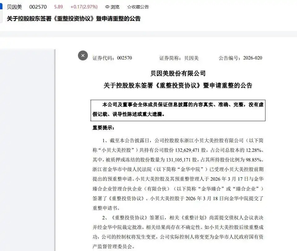 3月18日晚,贝因美公告称,其控股股东浙江小贝大美控股有限公司(下称“小贝大美控股”)已与金华臻合企业管理合伙企业(有限合伙)(下称“金华臻合”)签署《重整投资协议》。若小贝大美控股后续重整成功,贝因美实际控制人将变更为金华市国资委。