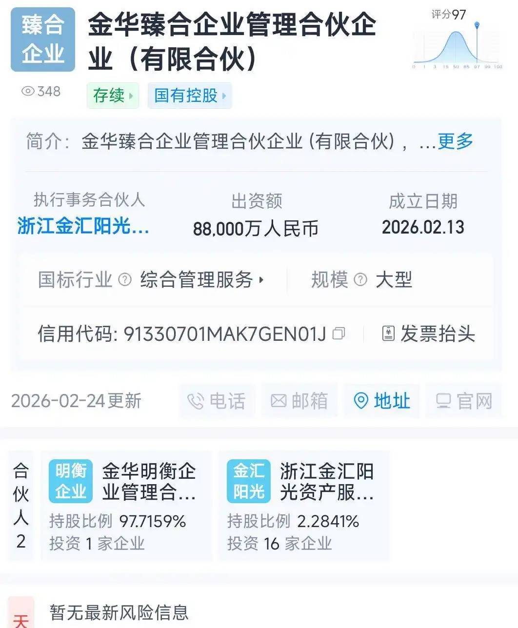 天眼查显示,金华臻合成立于2026年2月2日,出资总额8.80亿元,浙江金汇阳光资产服务有限公司与金华明衡企业管理合伙企业(有限合伙)为股东,二者持股占比2.28%、97.72%。穿透可知,二者背后均指向了由金华国资委、浙江省财开集团合资成立的金华市金融控股投资有限公司。