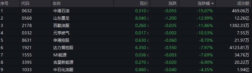 石油股、煤炭股逆势下跌,山东墨龙跌近13%,中石化油服跌超4%,兖矿能源跌近4%,中煤能源跌超2%。