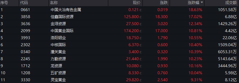 有色金属板块上涨,中国国际黄金、洛阳钼业、中核国际等多股涨超10%。
