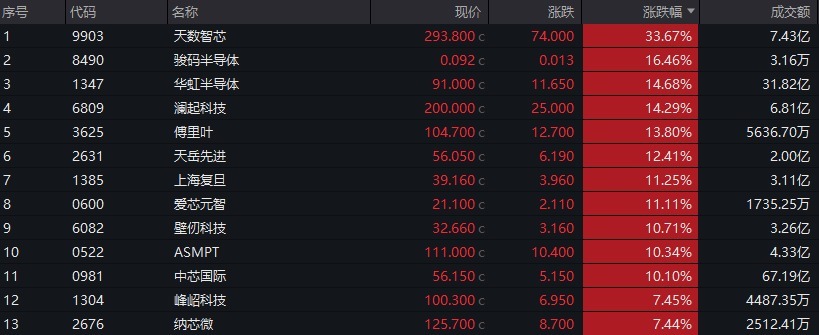 半导体板块领涨,华虹半导体涨超14%,上海复旦涨超11%,中芯国际涨超10%。