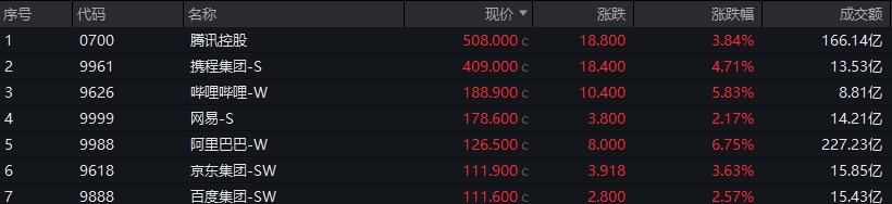 权重科技股普涨,美团涨超10%,阿里巴巴涨近7%,腾讯控股涨近4%。