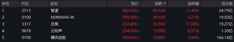 AI应用概念多股走高,智谱涨超11%,MINIMAX-W涨超5%。